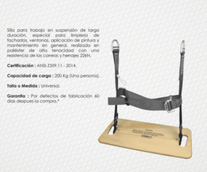 La silla es un elemento que hace parte del Sistema Personal de Trabajo seguro en alturas y su uso se recomienda en la realización de trabajos en alturas superiores a 1,50m), brindando y en trabajos prolongados en suspensión de mas de 5 minutos cumple funciones como: