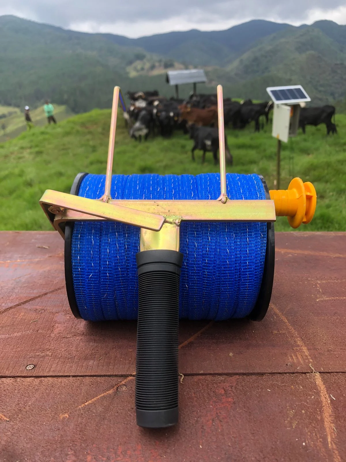 Dispensador resistente y práctico para cinta y cordón eléctrico, ideal para un tendido rápido, ordenado y eficiente en cercas ganaderas.