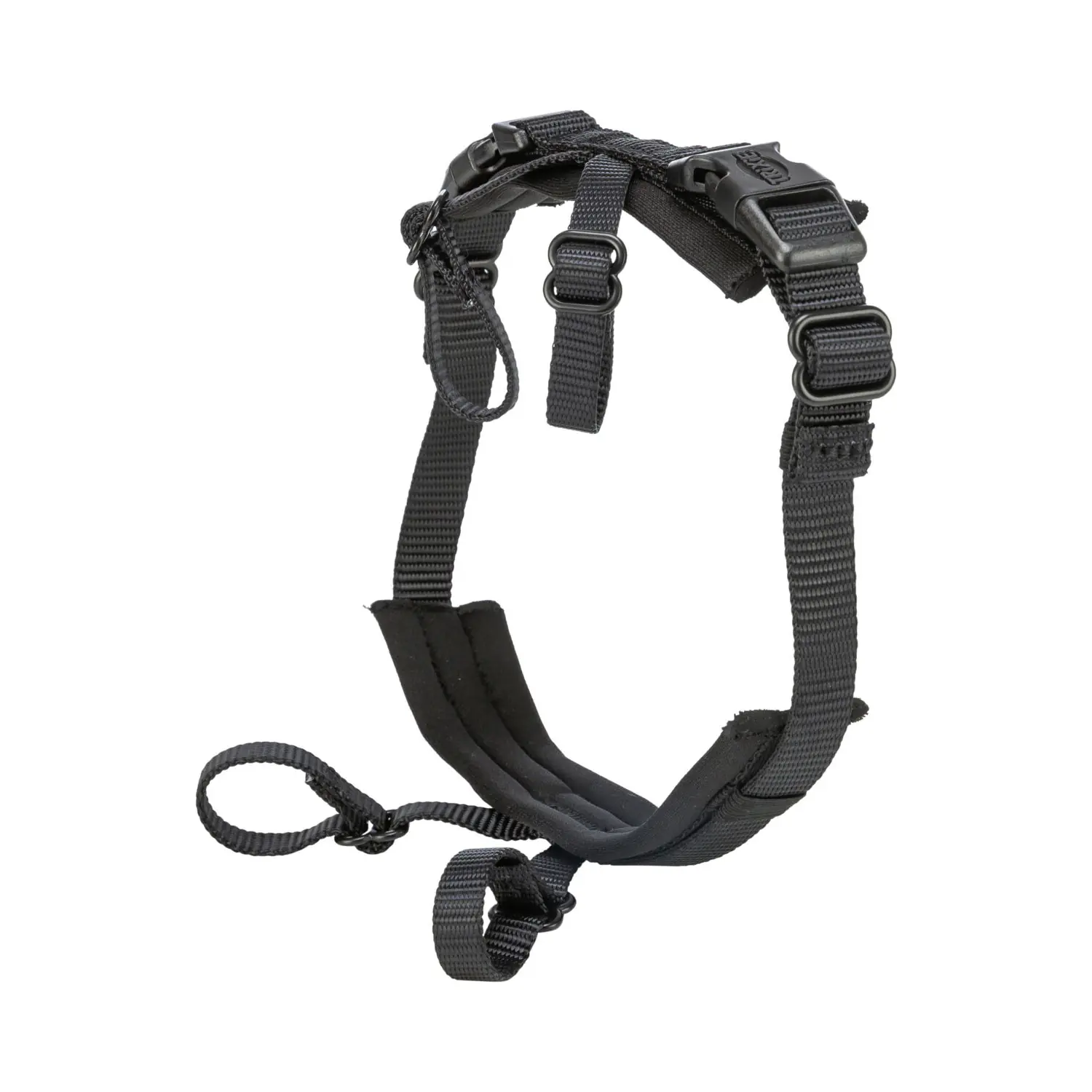 Accesorio de nylon y neopreno que se acopla a un arnés para evitar que el perro se escape en situaciones de estrés o pánico, ofreciendo un ajuste seguro y cómodo.