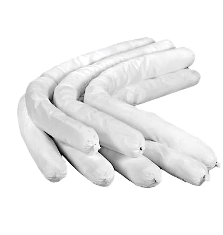 Barrera flotante diseñada para absorber derrames de hidrocarburos sin retener agua, ideal para uso en cuerpos de agua o zonas industriales.