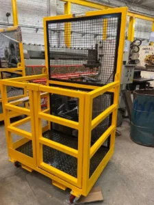 Canasta especial para telehandler y transporte de personal. Estructura metálica tipo jaula o plataforma, que se acopla a las horquillas o al sistema de acople rápido del telehandler.
