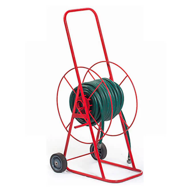 Estructura con ruedas y sistema de enrollado para transportar y organizar cables o mangueras largas en terreno.
