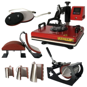 La máquina sublimadora Combo 8 en 1 es la estación de trabajo más completa para emprendedores que buscan cubrir el espectro total de la personalización con una sola inversión. Es una evolución del modelo 5 en 1, añadiendo accesorios específicos para formas más complejas.