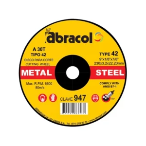 Discos Abrasivos (Acero y Metales): Fabricados generalmente con granos de óxido de aluminio o carburo de silicio. Son vitales para cortar perfiles metálicos, tuberías, láminas y barras de refuerzo en estructuras de ingeniería.