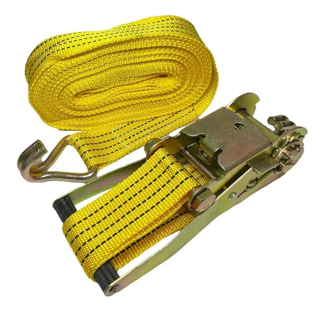 Eslinga trinquete Ratchet de alta resistencia, 9m x 50mm, con diseño de doble “J”. Capacidad de carga de 5,000 kg. Ideal para asegurar cargas de manera eficiente y segura. ¡Adquiera ahora para garantizar una sujeción confiable en su carga en el transporte !