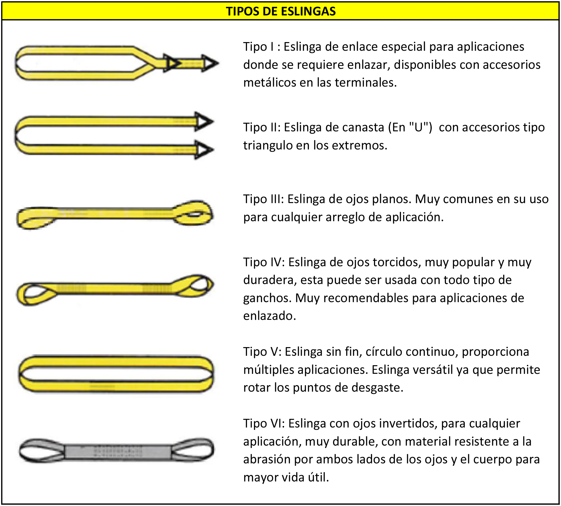 Código de Colores: Se fabrican bajo normativas internacionales (como la ASME B30.9) que asignan un color específico según su capacidad de carga, facilitando una identificación visual rápida y segura en el sitio de trabajo.