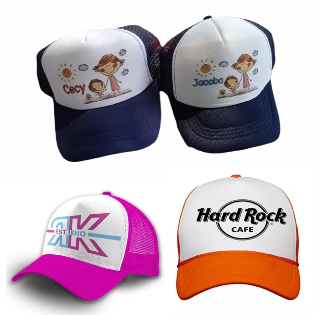 Gorras con marca en sublimación, permiten reproducir diseños complejos, degradados o incluso fotografías. Menor duración por su sustrato y técnica.