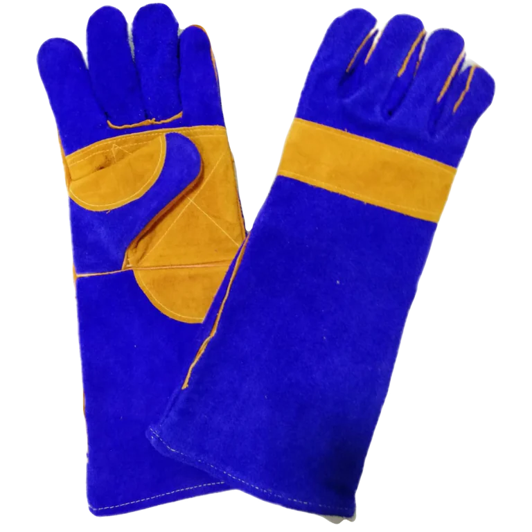 Guante fabricado en cuero de carnaza azul, con refuerzos en cuero carnaza de amarillo, cómodo y ergonómico especial para profesionales que buscan resistencia a las salpicaduras de metal fundido.