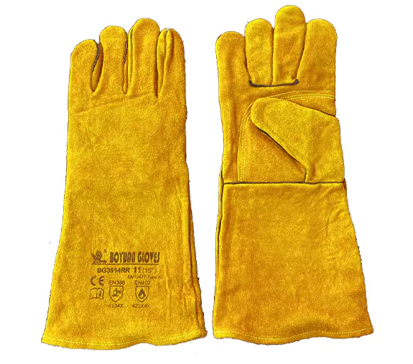 Guante soldador amarillo con refuerzo en palma, hilo kevlar y matachispas, con doble dulceabrigo. 16″