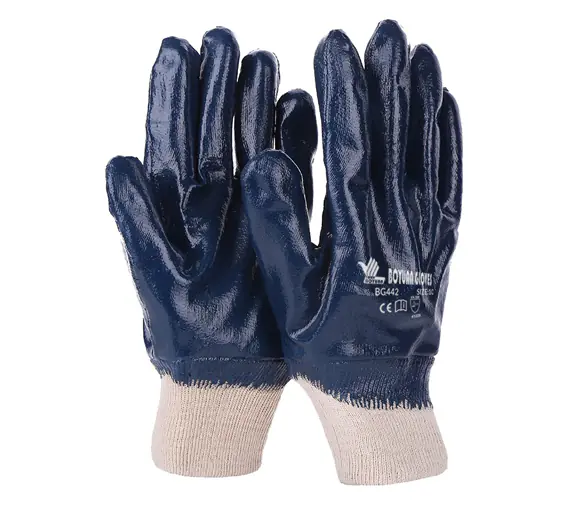 Guante de hilaza cubierto en nitrilo liso, puño elástico cerrado para manipulación general, riesgos mecánicos.