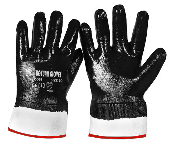 Guante con recubrimiento en nitrilo y forro interno jersey, proporcionando protección extra contra riesgos químicos y mecánicos.