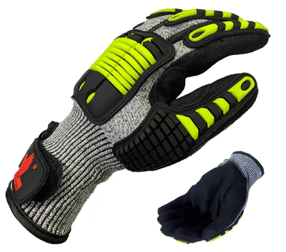 Guante con resistencia al corte nivel 5, Refuerzo interno en zona de la palma especial para reducir vibraciones generadas por impactos, protección externa contra impactos en material TPR de alta visibilidad y cierre mágico con material en velcro ajustable.