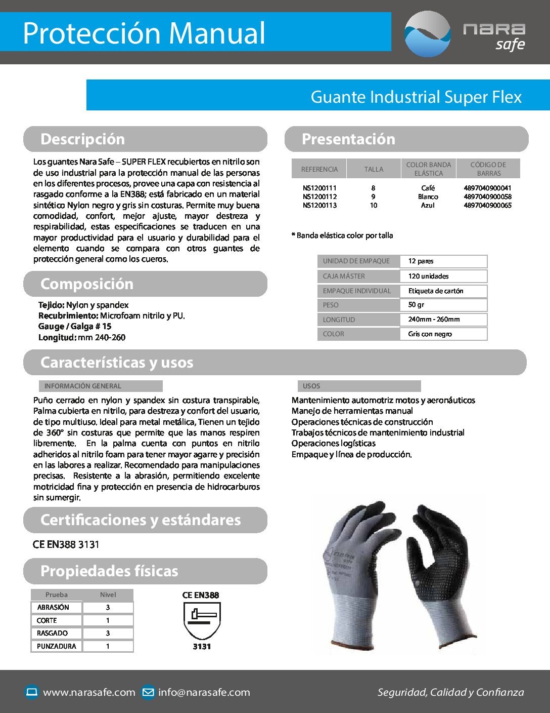 Los guantes Nara Safe – SUPER FLEX recubiertos en nitrilo son de uso industrial para la protección manual de las personas en los diferentes procesos, provee una capa con resistencia al rasgado conforme a la EN388; está fabricado en un material sintético Nylon negro y gris sin costuras. Permite muy buena comodidad, confort, mejor ajuste, mayor destreza y respirabilidad, estas especificaciones se traducen en una mayor productividad para el usuario y durabilidad para el elemento cuando se compara con otros guantes de protección general como los cueros.