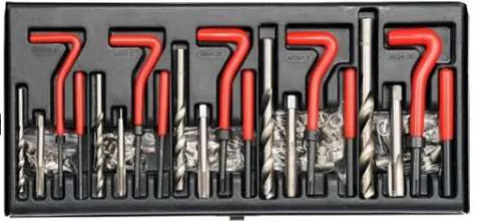 Este completo kit está diseñado para reparar roscas dañadas de forma rápida y precisa. Incluye insertos helicoidales, machuelos, brocas y herramientas de instalación para diferentes tamaños de rosca, permitiendo restaurar la funcionalidad original de componentes metálicos sin necesidad de reemplazarlos. Ideal para talleres mecánicos, mantenimiento industrial y aplicaciones automotrices.