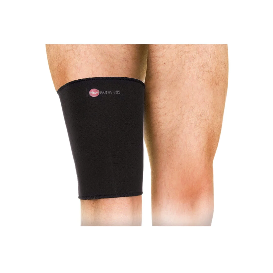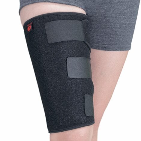 Funda de neopreno que permite transpiración cubriendo el muslo para dar soporte total en el área de la lesión aumenta la temperatura mejorando la circulación.