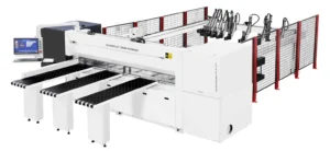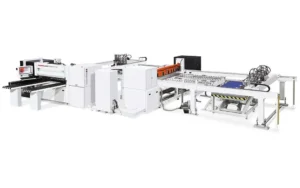 En este sistema, el tablero se corta longitudinalmente en una sección y, de forma automática, las tiras resultantes pasan a la segunda sección para realizar los cortes transversales sin intervención humana.