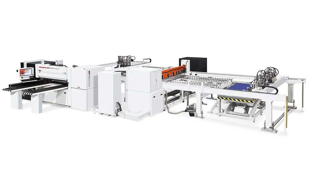 Estación de Carga: Los tableros (generalmente en paquetes de 4 a 10 láminas) entran desde un elevador trasero o sistema de ventosas.