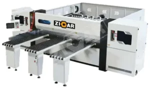 Corte Longitudinal (Eje X): La primera sierra realiza los cortes a lo largo del tablero, creando «tiras» de madera.
