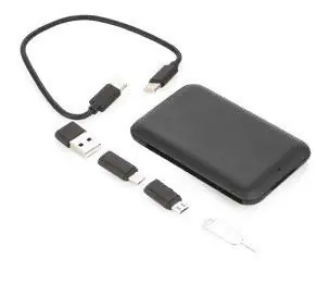 Set Cables Travel TE0661 Juego de cables de carga con puertos USB, Tipo-C y Lightning, 5V DC 3.1, que incluye un adaptador para expulsar la tarjeta SIM del celular.