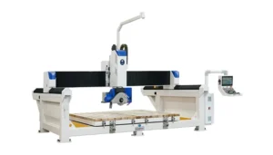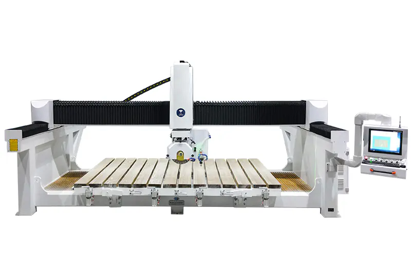 La sierra de puente CNC de 5 ejes es la cúspide de la tecnología en el procesamiento de superficies sólidas (piedra natural, sintética y cerámica). A diferencia de la versión de 4+1 ejes, la de 5 ejes ofrece una libertad de movimiento absoluta, permitiendo realizar trabajos tridimensionales complejos que antes solo eran posibles mediante el esculpido manual.
