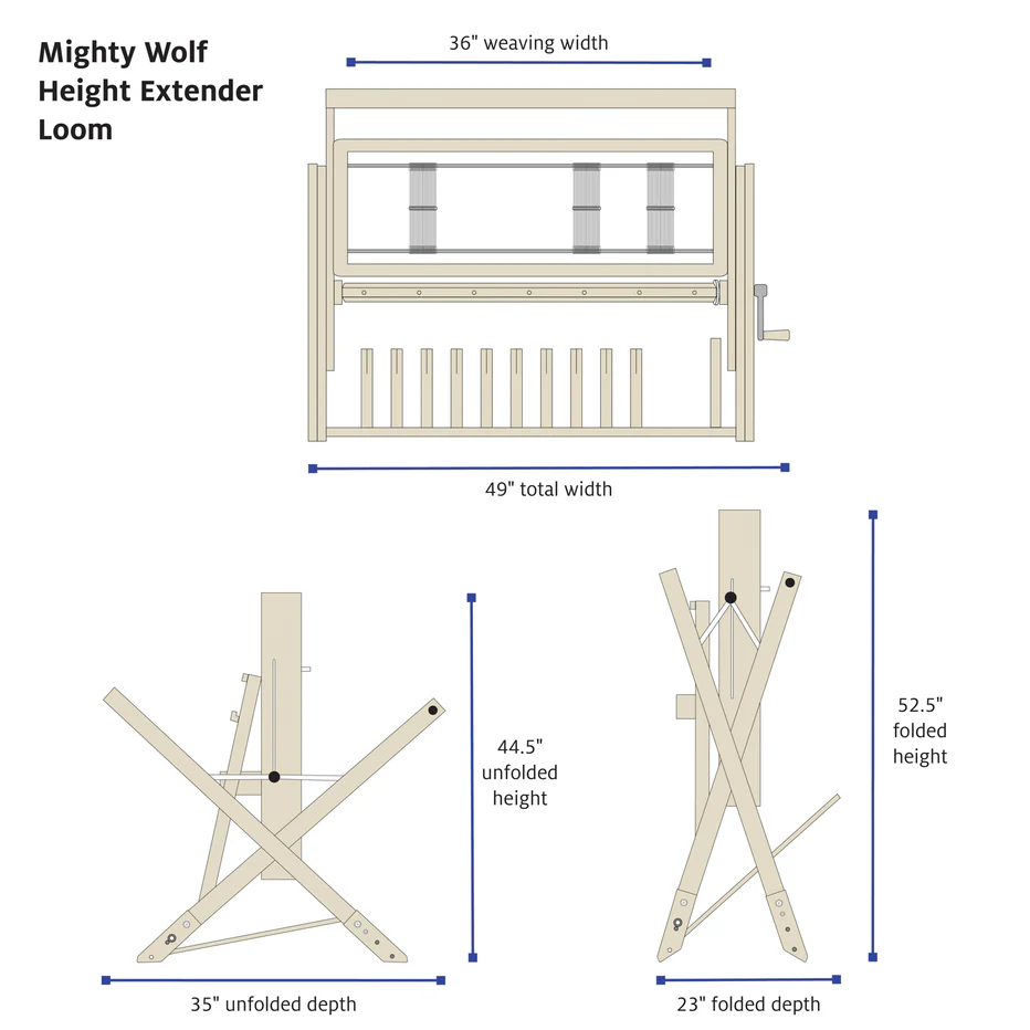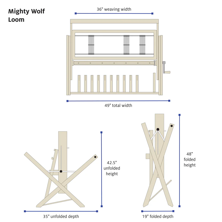 Como todos los telares de la familia Wolf, el Mighty Wolf presenta un diseño de marco en X plegable, un freno de fricción, una viga trasera removible para facilitar la urdimbre y la construcción de alta calidad de Schacht.
