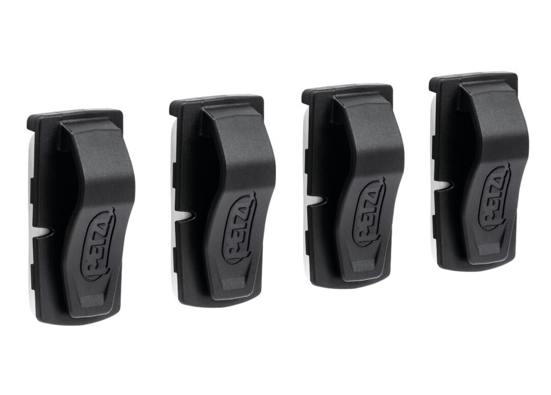 Cuatro clips adhesivos que permiten fijar una linterna frontal Petzl a los cascos que no disponen de ganchos.